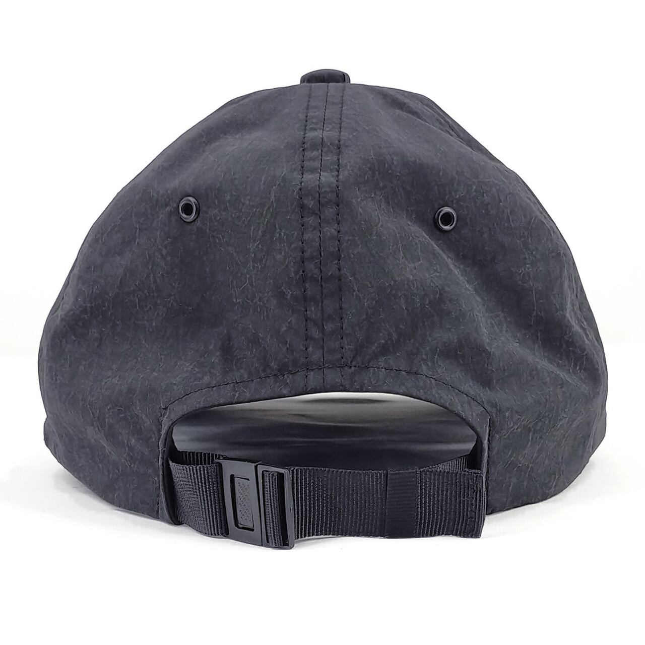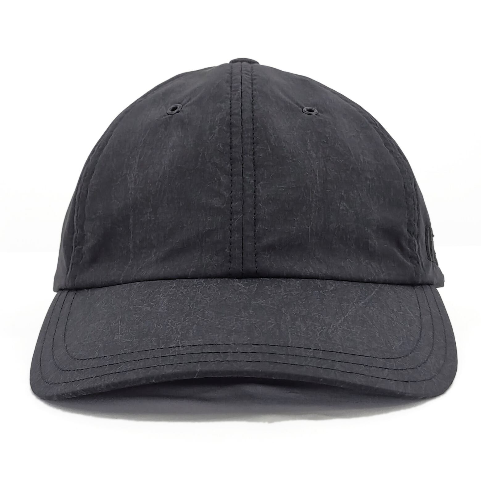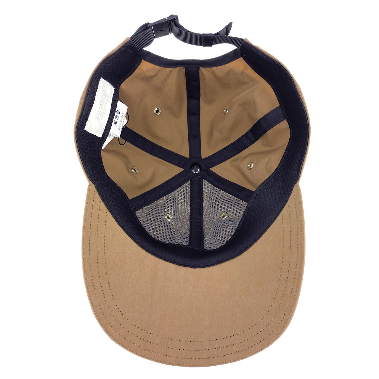 表面にグローゼル加工を施した素材が特徴です。ランダムなシワとアタリが付きビンテージ感のある表情が生まれました。また、サイドに振った同色の刺繍は控えめで無地ライクに着用出来ます。内側に吸汗速乾のテープを使用。