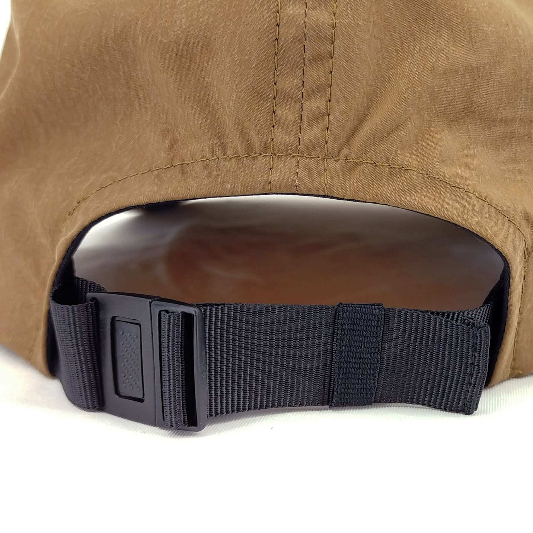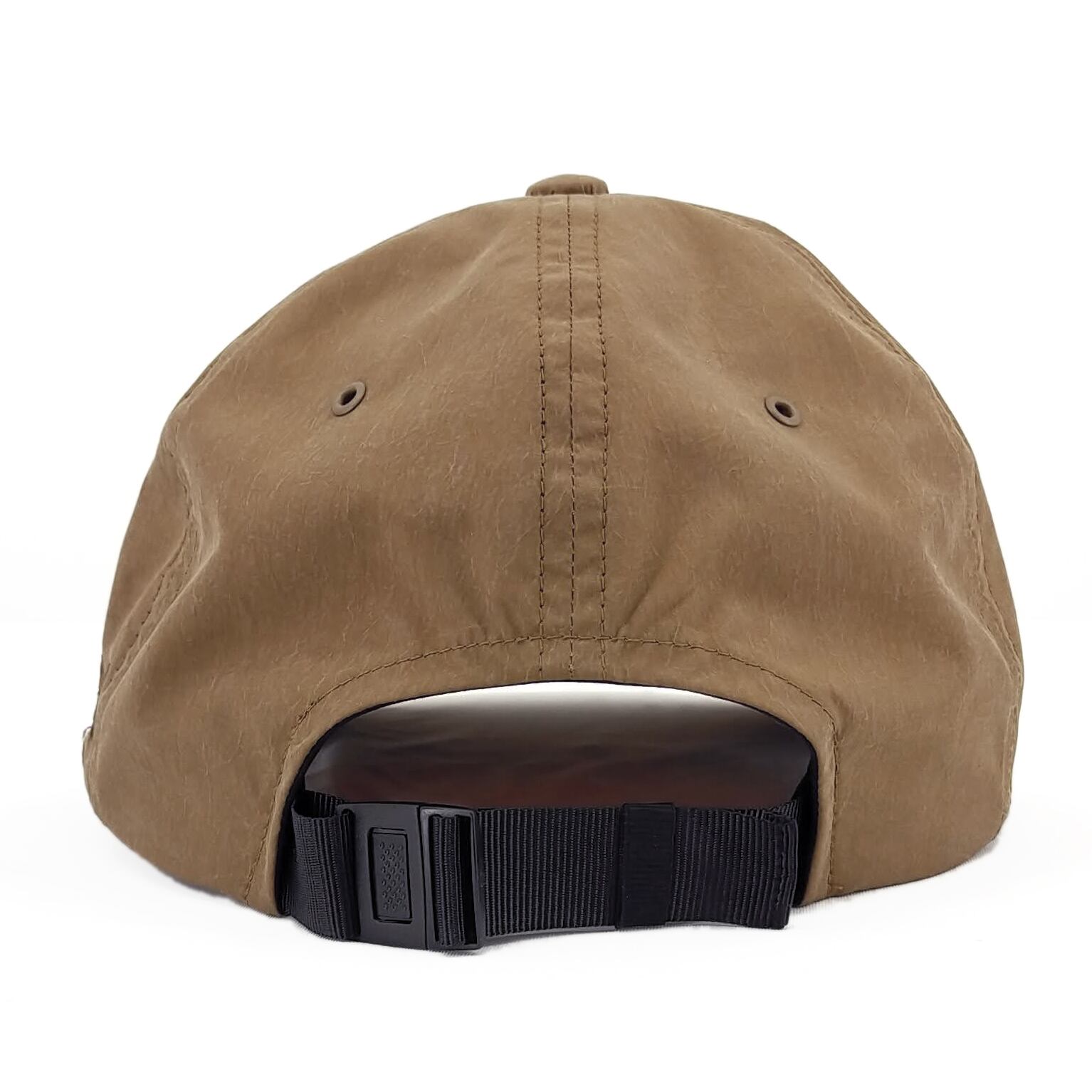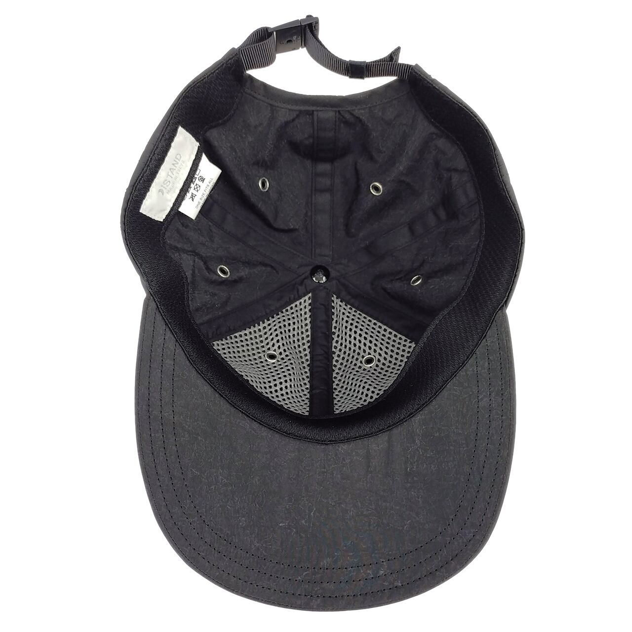 表面にグローゼル加工を施した素材が特徴です。ランダムなシワとアタリが付きビンテージ感のある表情が生まれました。また、サイドに振った同色の刺繍は控えめで無地ライクに着用出来ます。内側に吸汗速乾のテープを使用。